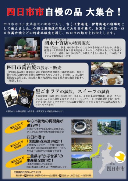今回は東海道の起点である日本橋で、お菓子·お酒·四日市萬古焼などの特産品販売を通じ、四日市の魅力をお伝えします。