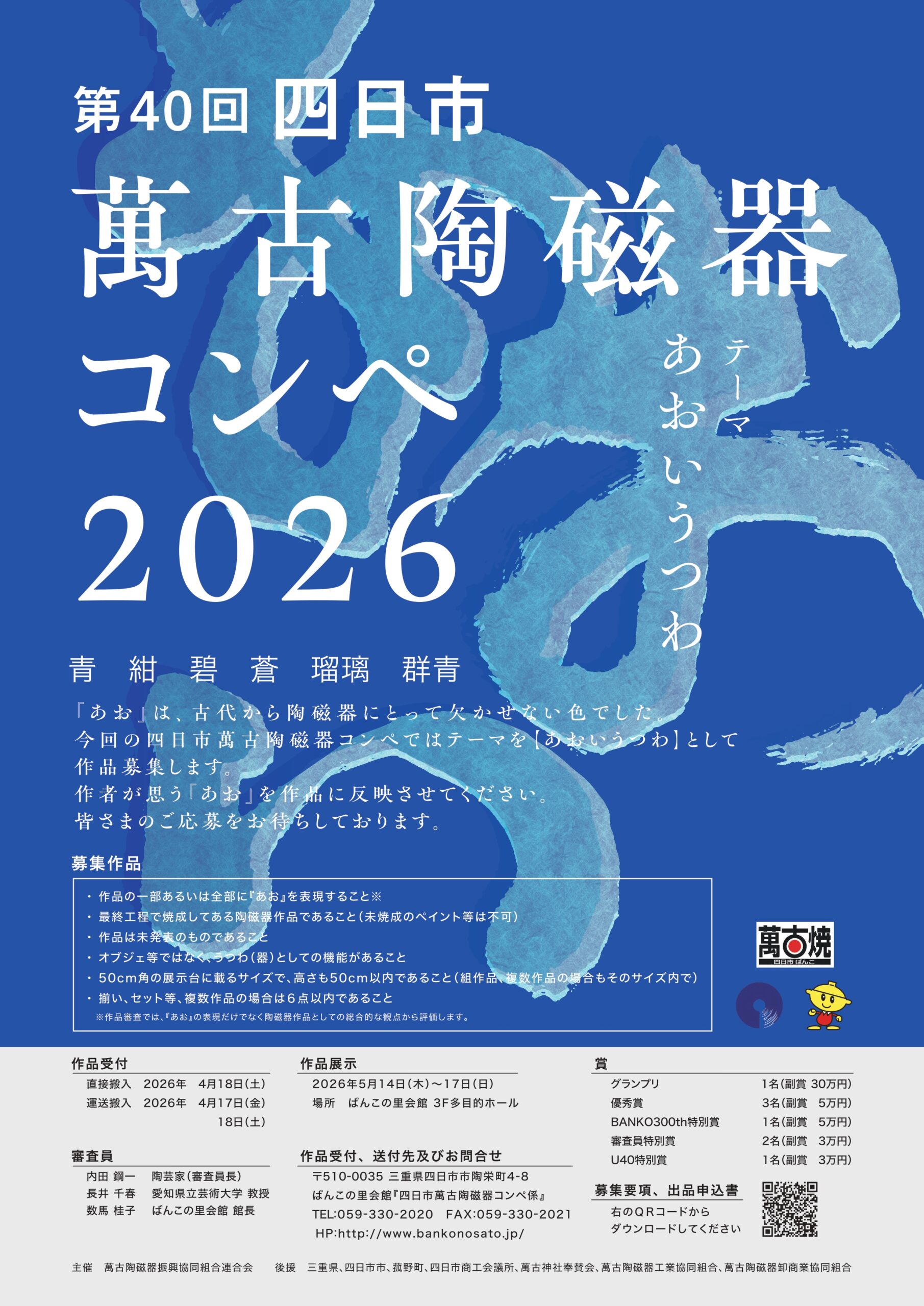 「あお」は、古代から陶磁器にとって欠かせない色でした。今回の四日市萬古陶磁器コンペではテーマを【あおいうつわ】として作品募集します。作者が思う「あお」を作品に反映させてください。